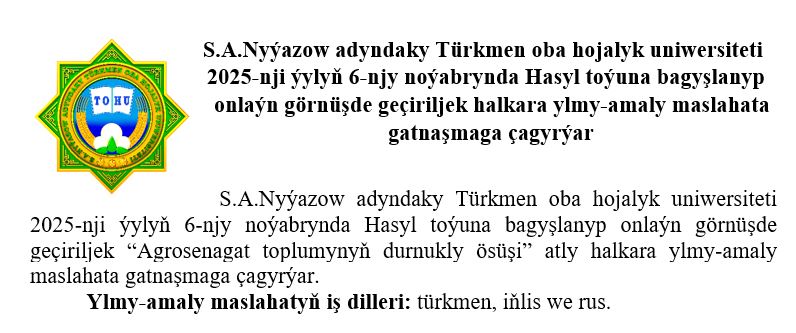 13. S.A.Nyýazow adyndaky Türkmen oba hojalyk uniwersitetiniň salgysy: Aşgabat ş., 2009 (Görogly) köçe, 143-nji jaý.