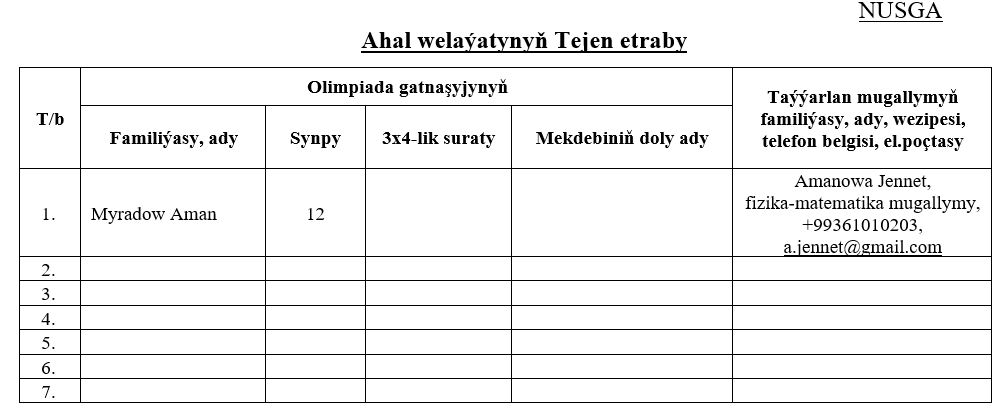3.4.2. 1-nji tapgyrda her etrapdan (şäherden) tapawutlanan 3 okuwçy 2-nji tapgyra gatnaşmaga hukuk gazanar. Etrap (şäher) bilim bölüminiň jogapkär hünärmenleri 2-nji tapgyra gatnaşmaga hukuk gazanan okuwçylaryň maglumatlaryny aşakdaky nusga laýyklykda dolduryp, tm.tau.2022@gmail.com elektron salgysyna ugratmaly;